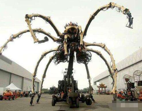 50英尺长的机械蜘蛛爬上大楼。