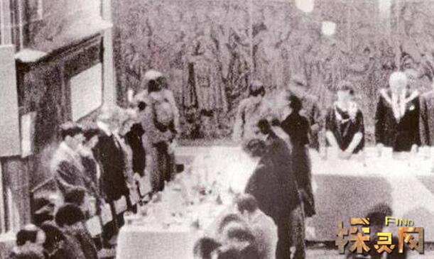 《闯进考文垂的幽灵》,世界十大灵异照片之一,摄于1985年1月22日。考文垂组织成员低头祈祷。显然,晚宴上有一个重要人物,但客人们不记得在聚会照片的左上角看到过那个戴头巾的男人。