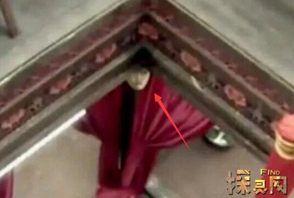 镜头中还捕捉到了一些古建筑一楼的画面。令人惊讶的是,一楼拐角处的柱子顶端出现了一张苍白的脸。整个镜头大概持续了两三秒钟。截图放大后可以看到这个鬼脸的整体轮廓,还能隐约看到鬼脸上的五官。两边都是柱子和红色窗帘,看起来很诡异。