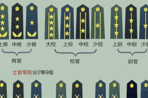 在我国,将官军衔从高到低分别为上将、中将、少将,校官军衔分别为大校、上校、中校、少校,初级军官军衔从高到低分别为上等兵、中尉、少尉。士官共有七个军衔,分别是一级军士长、二级军士长、三级军士长、四级军士长、中士、中士、下士及以下军衔。