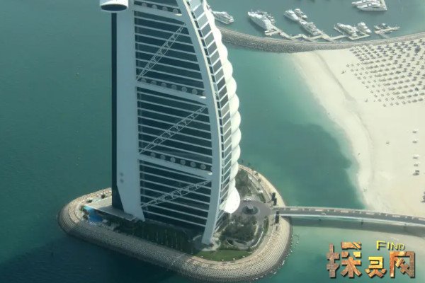 迪拜帆船酒店高约321米,是世界上最高的酒店,甚至比法国的埃菲尔铁塔还高一点。它建在一个人工岛上,有一个与内陆相连的堤岸,花了五年时间建成。据说当时在40米深的海底用9000吨钢材打入了250根基建桩。