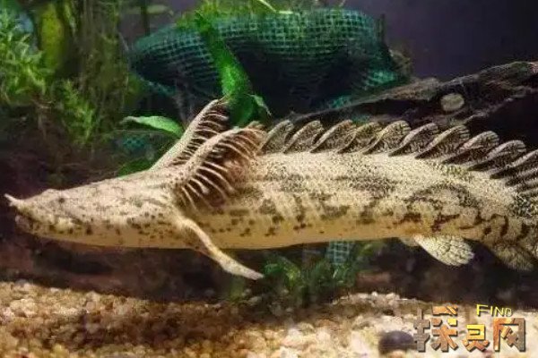 虎纹恐龙王鱼体管状,具菱形硬鳞,头扁平,有一对短须,下颚突出,条纹从背部延伸至腹部,腹部为白色和黄色,头、体和尾鳍有黑色斑点,背部有多刺背鳍,一般有11-15个背鳍,胸鳍圆形,胸鳍和腹鳍基部有肌肉结构,可使其“成。