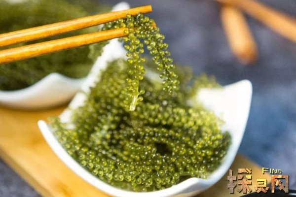 此外,还有一种绿藻食品,又称海葡萄。它的学名是长梗凤尾蕨。它的外观看起来圆润饱满,就像一串晶莹剔透的葡萄。它的味道和外观像鲑鱼卵,所以它也被称为绿色鱼子酱。吃起来像噗,散发着鲜美的咸味,有鱼子酱的神韵。它被誉为植物界的“绿色鱼子酱”。