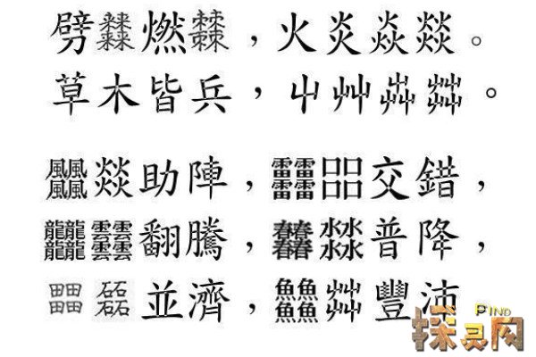 “一”字由三个“一”堆组成。它是“回”字的变体,属于各种草的总称。它还有一个“h”的发音,意思是速度快。“子”是四个“子”的组合。最初,它指的是茂密的草地和杂草丛生的蕨类植物。后来被当作“莽”的代名词。如《句读》中写:“(子),庶人呼莽也”。