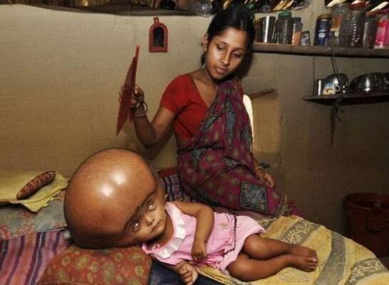 自2012年6月出生以来,罗娜贝古姆(Rona Begum)的头部因脑积水而膨胀至91厘米。她的头比正常孩子的头大三倍,看起来像个外星人。贝古姆只能躺在床上,四肢可以活动,但头不能动。
