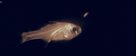 介形虫是一种微小的海洋甲壳类动物,看起来和大小都像淡水中的鱼虫。很多种类的介形虫体内都进化出了精巧的腺体,可以产生一种含荧光素酶的液体,也可以产生另一种含荧光素酶的液体。只要将两种液体混合,发光的介形虫就能瞬间发出美丽的蓝色冷光,这就是上图中“喷火鱼”发出的火焰。太平洋战争期间,日本海军的水兵收集了大量的发光介形虫,作为夜间查看海图时的自然光源。