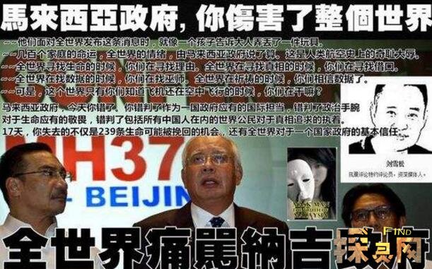 飞机失事后,马来西亚政府内部人员竭力掩盖真相,隐瞒事故地点,以拖延搜救时间,确保黑匣子信息覆盖范围被改写或永久消失。所以马来西亚的表现出现了飘忽不定,不稳定,差得不可思议。因为他们知道,他们必须为239人的生命负全责!另外,恐怕大家知道真相后都会把马来西亚撕成碎片!没有残骸,没有黑匣子,甚至没有具体的经纬度。当马来西亚政府认为“有必要通报”的时候,它平静而坚定地告诉世人,他们原定飞往中国北京的飞机已经坠毁在南印度洋。当他们向全世界发布这个消息时,就像一个孩子告诉一个大人他丢了一个玩具。