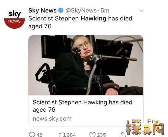 斯蒂芬威廉霍金,1942年1月8日出生于英国牛津,英国剑桥大学著名物理学家,近代最伟大的物理学家之一,20世纪享有国际声誉的伟人之一。他今天死了!当这一消息传遍网络时,世界各地的网民一致在社交媒体上发起纪念活动,纪念这位伟人的逝世。