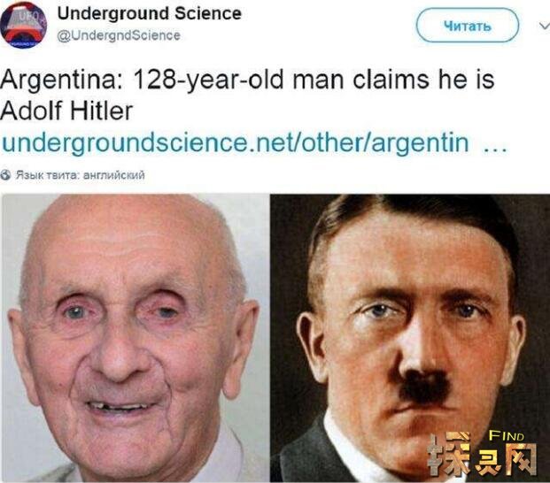 日前,网上曝出阿根廷一名128岁的男子声称“我是希特勒,但我没死”,称他在二战期间假死逃生,隐居阿根廷70多年。希特勒128岁没死的消息在网上引起热潮,网上还公布了一张老人和希特勒的对比照片,看起来惊人的相似,一度让人怀疑可能是真的。