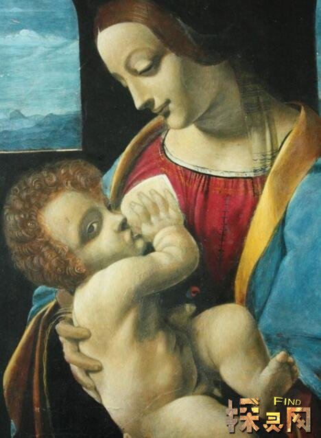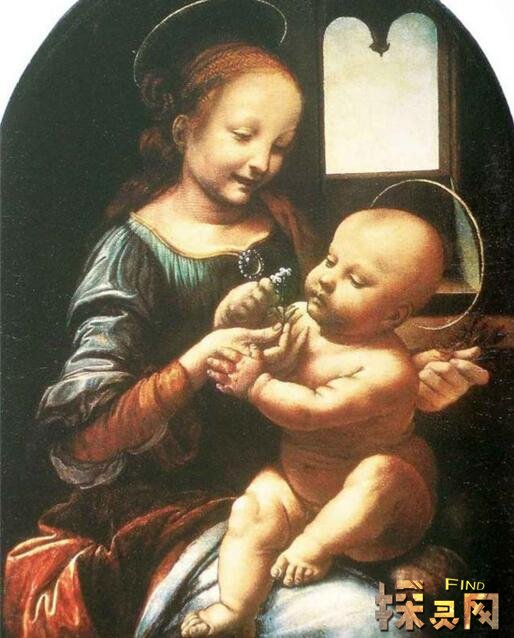 103010在这里,画家更强调母爱的普世人性。饱满的形象,文静的举止,洋溢着一个年轻母亲对儿子的温柔的爱。但是圣母的脸还是表现出达芬奇惯用的描写公式,过于注重女性眼睛的块状结构(在他之后的大量圣母形象中表现出来)。
