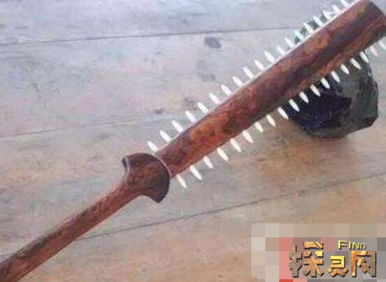 黑曜石锯剑是一种锯形的双刃剑,长约1米。黑曜石磨尖后镶嵌在木棍上,是非常厉害的武器。在战争中,这样的武器虽然重量很重,但挥舞起来却极具杀伤力,而且刀刃非常锋利。