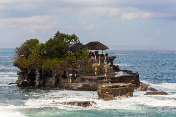 海洋神庙是巴厘岛最重要的海滨神庙之一。它诞生于16世纪,坐落在海边一块巨大的岩石上。每当涨潮时,岩石就会被海水包围。海神庙与陆地隔绝,孤零零地矗立在海水中。在一块巨大岩石的岩壁上,有几条有毒的海蛇。传说他们是海神庙的守护神,防止入侵者。