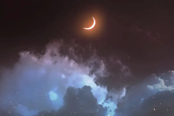 在农历中,每月的第一天月亮位于太阳和地球之间。此时,人们看到的只是月亮背对太阳的黑暗面,所以此时月亮一般是看不见的。我们称之为新月或新月。注意,这个月相几乎和太阳同升同落。只有发生日食时,我们才会注意到新月的存在。