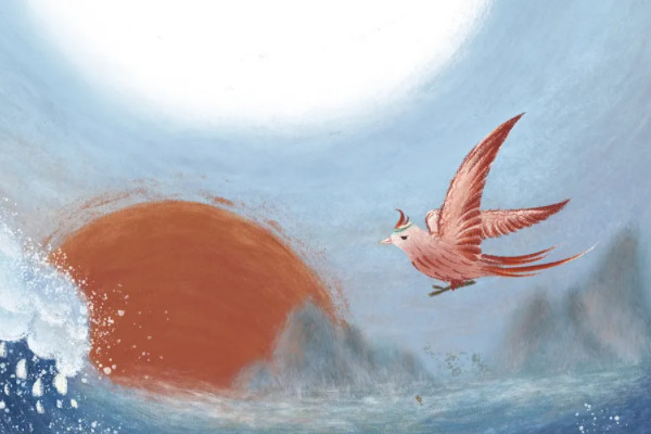 炎帝的女儿精卫,在一次游览东海时被风暴淹死,变成了一只有神力的鸟。年复一年,她日复一日地去东海投石填海,她像追逐太阳的夸父一样顽强。另外《诗经玄鸟》中记载精卫婀娜多姿,飘逸的长发,背上长着翅膀,看起来像只乌鸦。