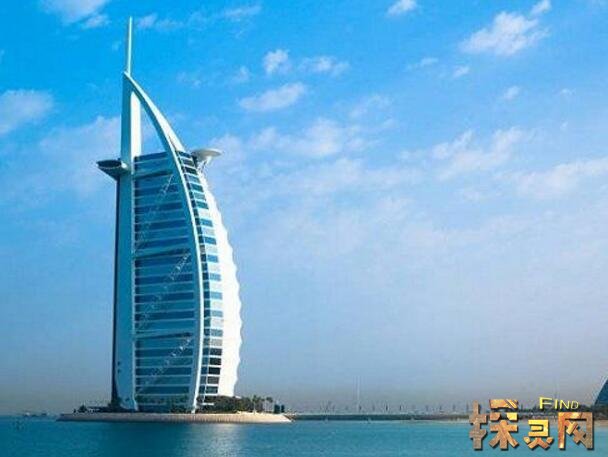 迪拜帆船酒店(Dubai Sailing Hotel)原名阿拉伯塔酒店(Arabian Tower Hotel),因其外形酷似船帆,也被称为迪拜帆船酒店(Dubai Sailing Hotel)。酒店建在波斯湾的一个人工岛上,距离海滩海岸280米。只有一条弯弯曲曲的路与陆地相连,共56层,高321米。酒店顶部有一个从建筑边缘伸出的悬臂梁结构的停机坪。