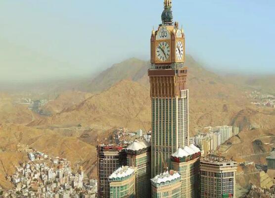 麦加皇家钟楼酒店位于沙特阿拉伯的伊斯兰圣城麦加。整个建筑高601米,总建筑面积150万平方米,120层。在顶部,一弯新月是由黄金制成的。距离400米有四个钟。每个钟高80米,宽65米,直径40米。每逢节日,钟楼会发出16道彩色光束。它在夜晚看起来很华丽。